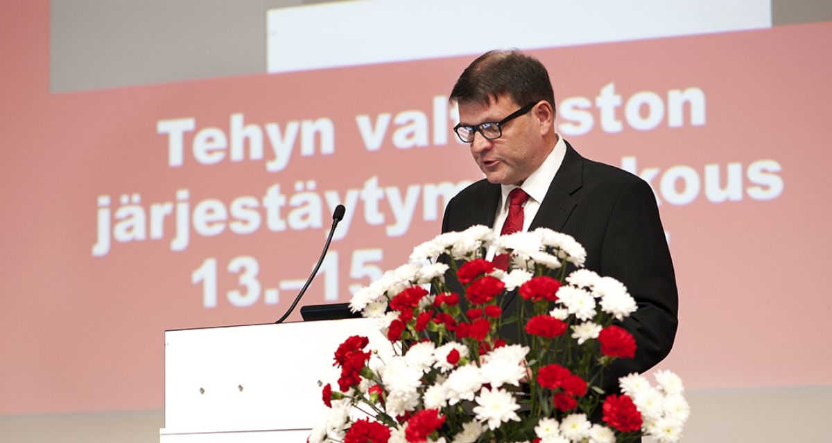 Sosiaali- ja terveysalan ammattijärjestön Tehyn puheenjohtaja Rauno Vesivalo piti jäähyväispuheen Tehyn valtuuston järjestäytymiskokouksessa Helsingin Messukeskuksessa. Huomenna tiistaina Tehylle valitaan aamupäivän aikana uusi puheenjohtaja.